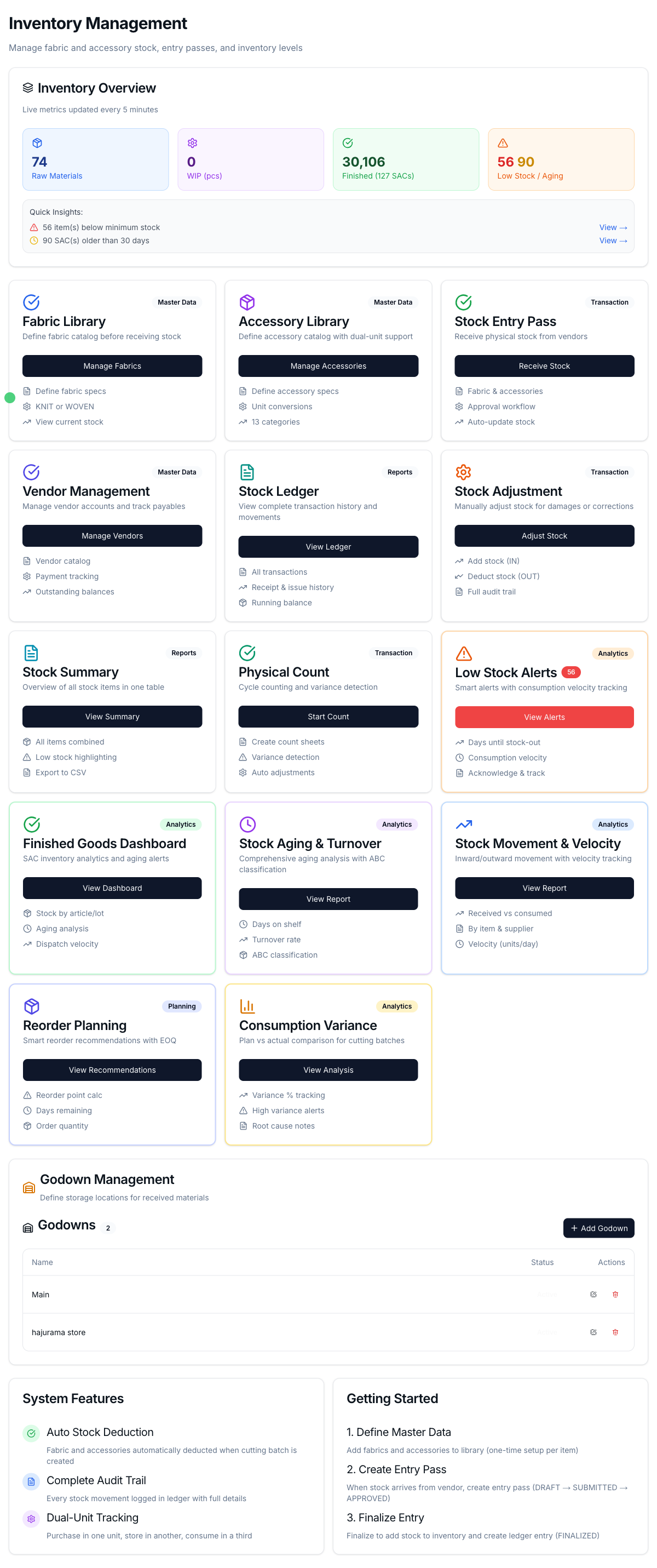 - Entry pass management for fabric/accessory receipts with QR labels and godown tracking