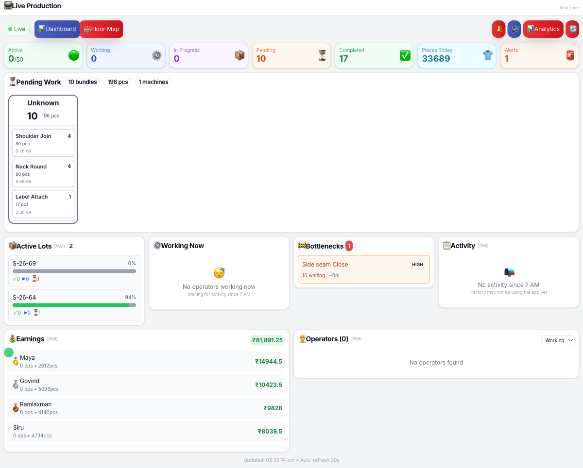A sewing line has been stuck for 2 hours — but you only discover it at end of day. No real-time monitoring, no line balancing alerts, no way to redistribute work before it becomes a 500-piece bottleneck.