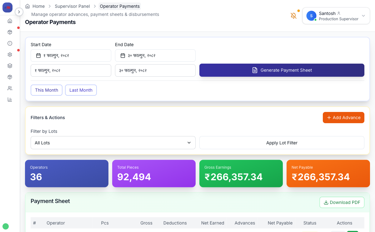 Full English and Nepali interface. Sewing operators work in their preferred language.