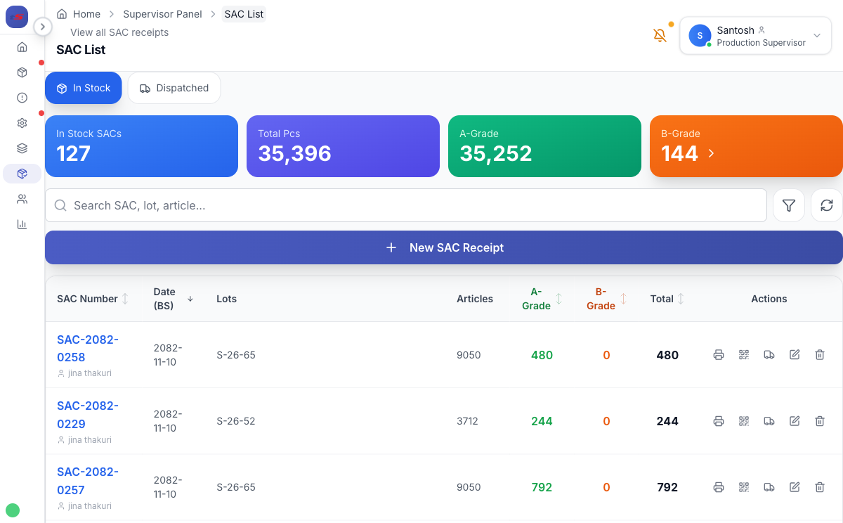 - SAC receipts with A/B quality grading, atomic numbering (SAC-2082-0001), and QR labels